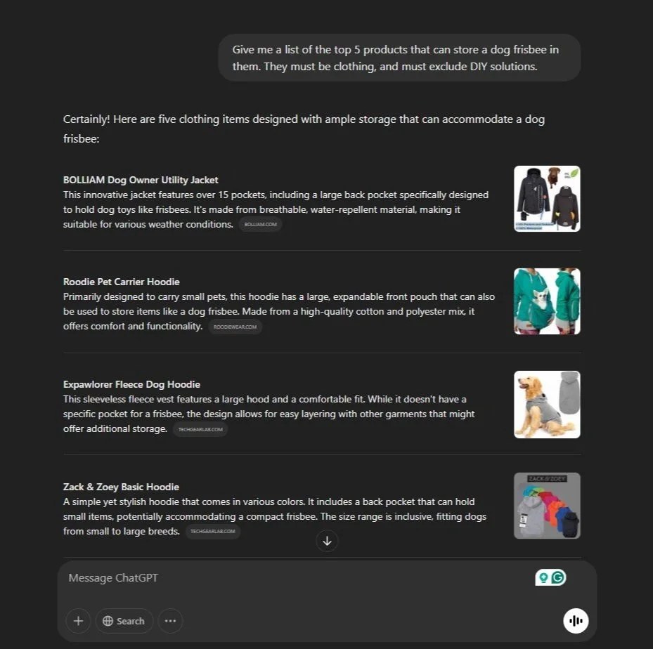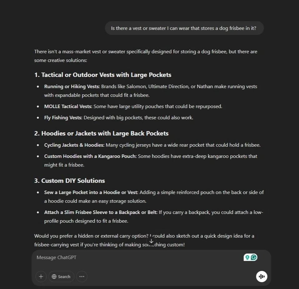 Input: “Give me a list of the top 5 products that can store a dog frisbee in them. They must be clothing and must exclude DIY solutions.”