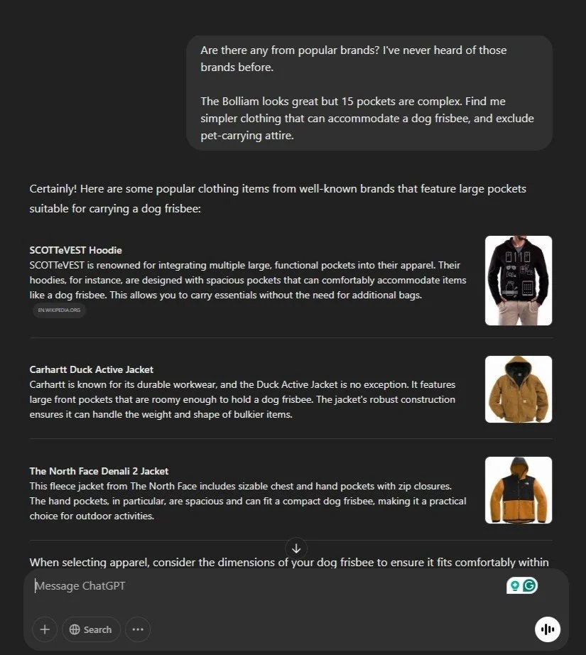 Input: “Are there any from popular brands? I’ve never heard of those before. The Bolliam looks great but 15 pockets is too complex. Find me simpler clothing that can accommodate a dog frisbee. Exclude pet carrying attire.”
